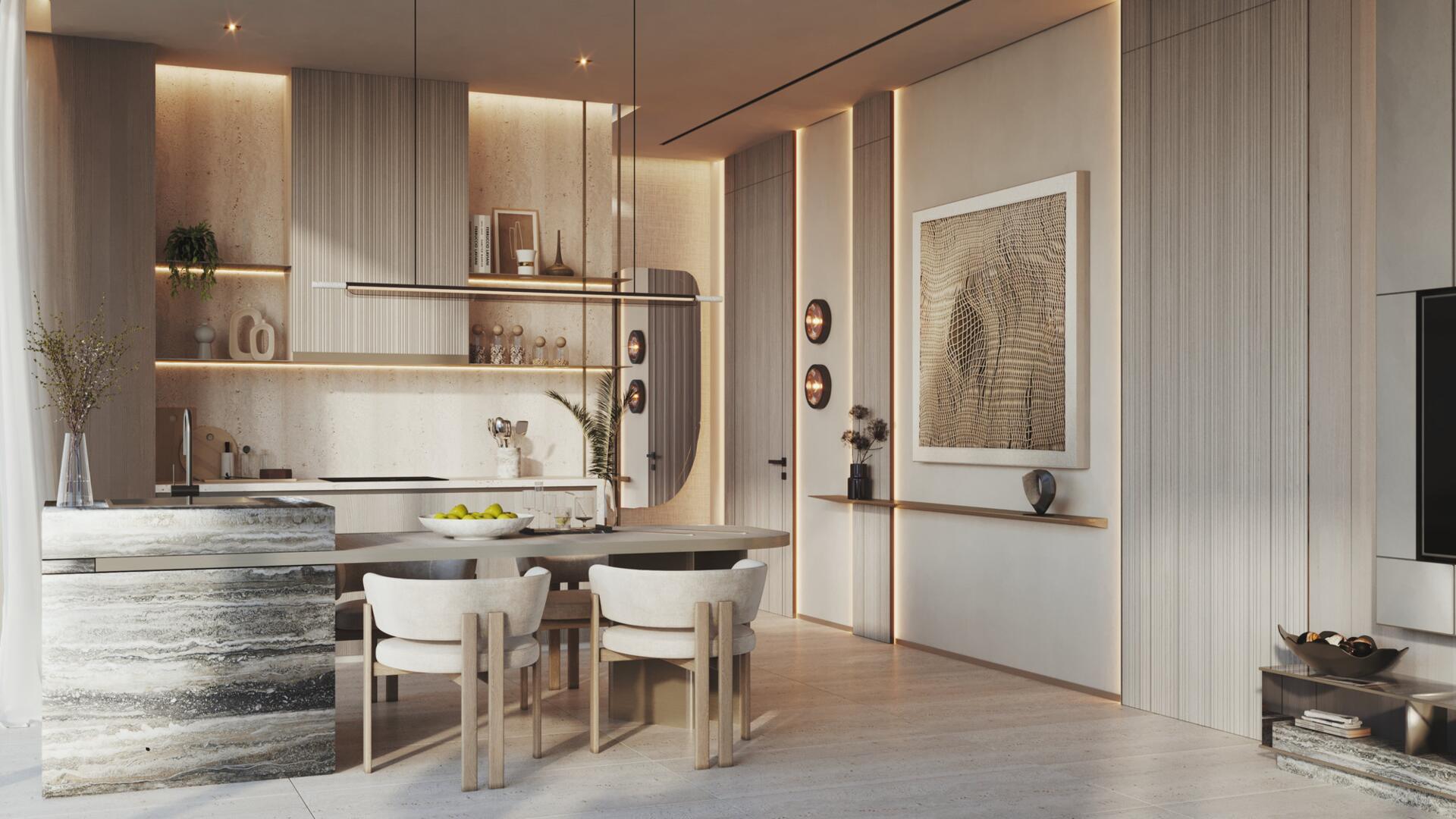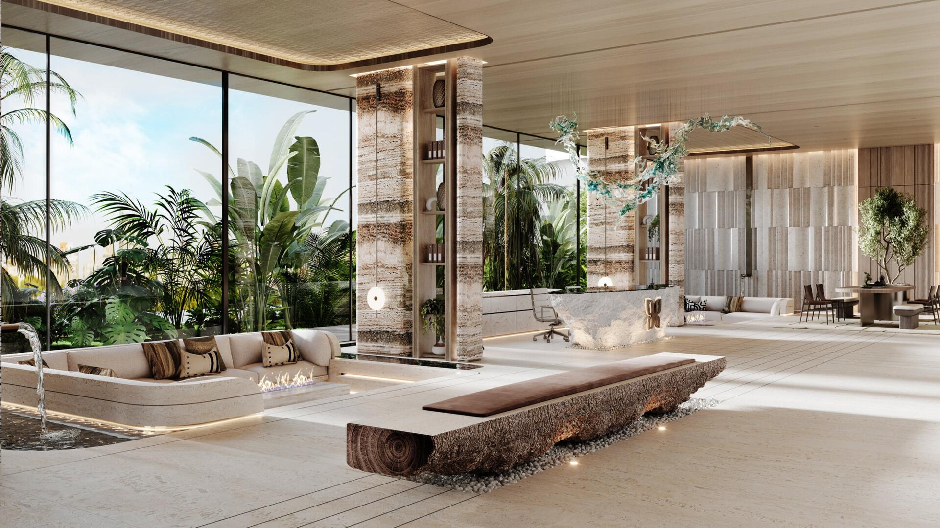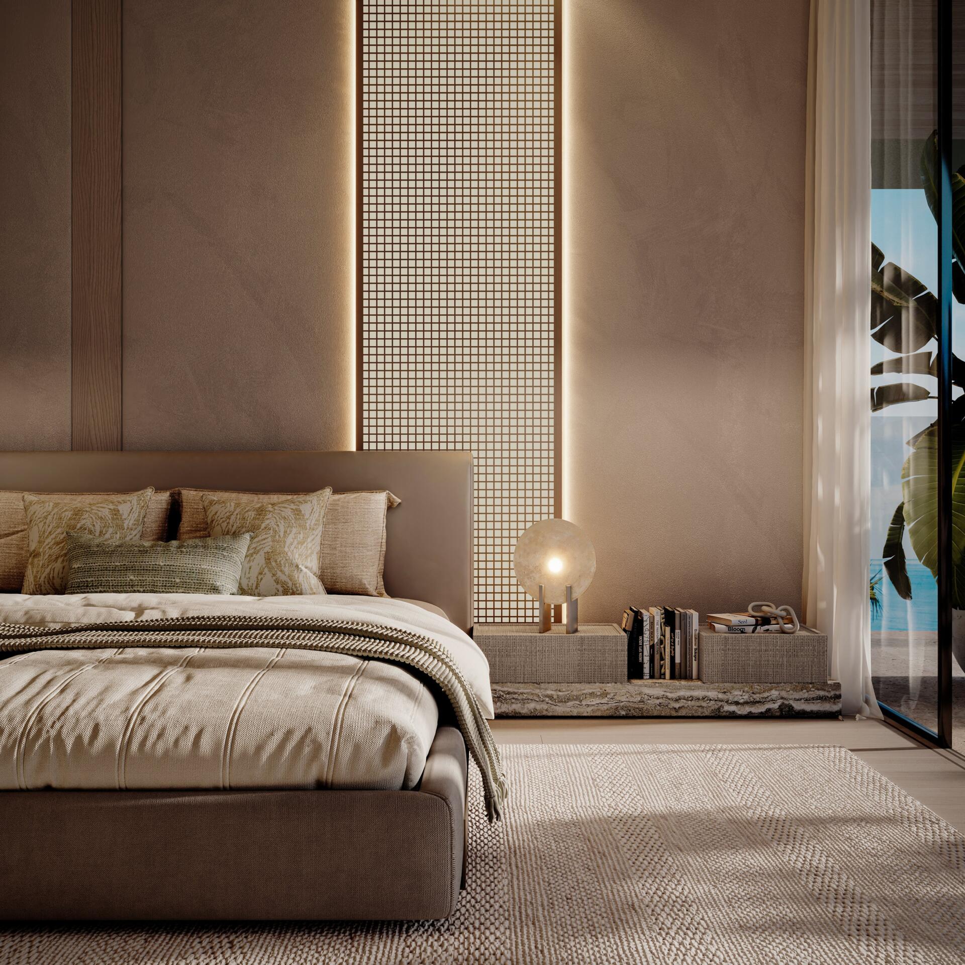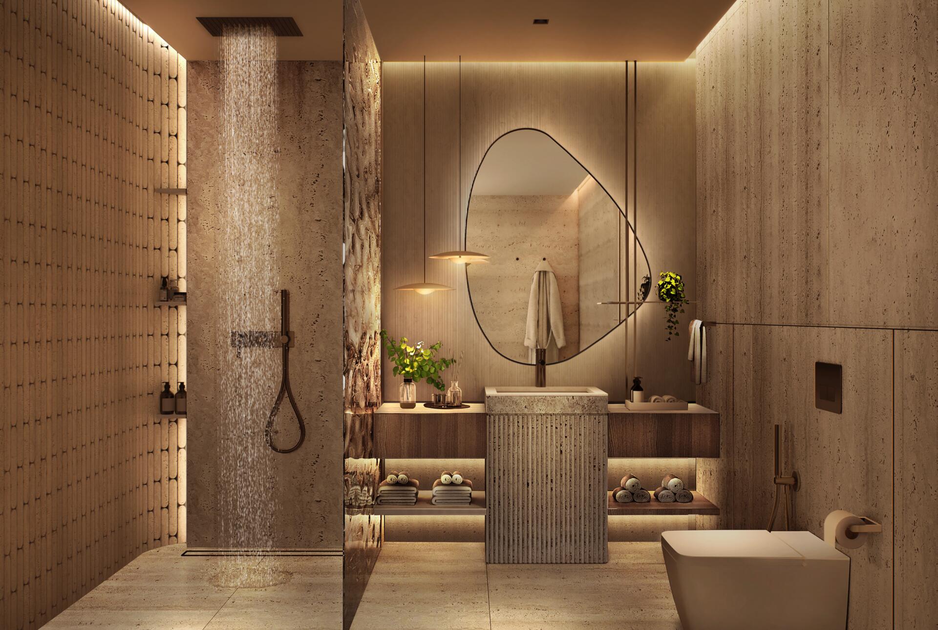 The project features 232 fully furnished residences — studios ranging from 380 to 560 sq ft, 1-bedroom apartments from 800 to 1370 sq ft, and 2-bedroom units from 1500 to 2500 sq ft. All 2BR apartments come with private pools, and every home includes a private balcony. The 1BR and 2BR layouts offer walk-in closets and well-defined spatial circulation. Interiors combine stone and wood finishes, built-in storage systems, soft carpets, neutral upholstery, and warm lighting. Bathrooms feature rainfall showers, stone vanities, and concealed lighting for a refined, spa-like ambiance.