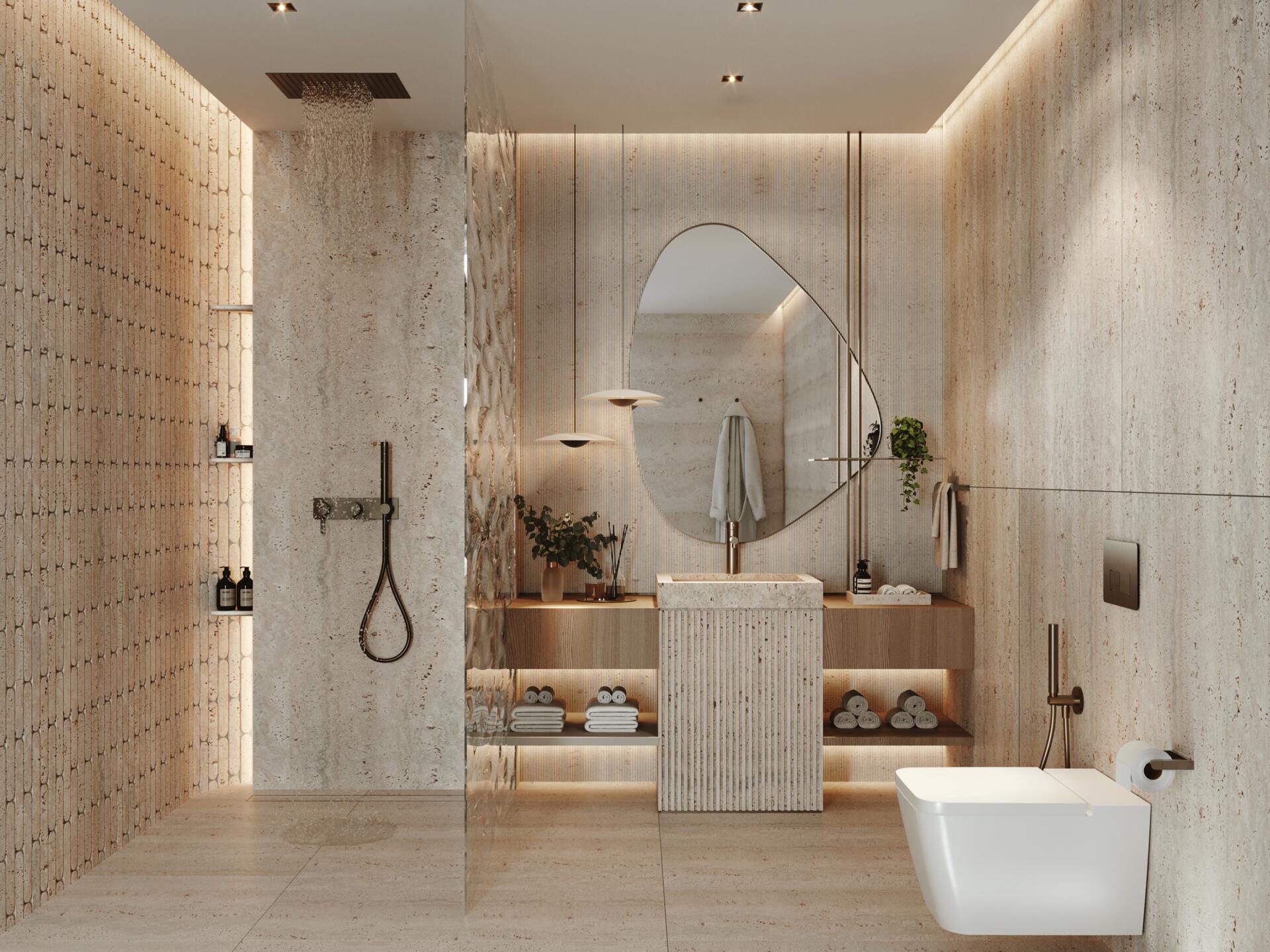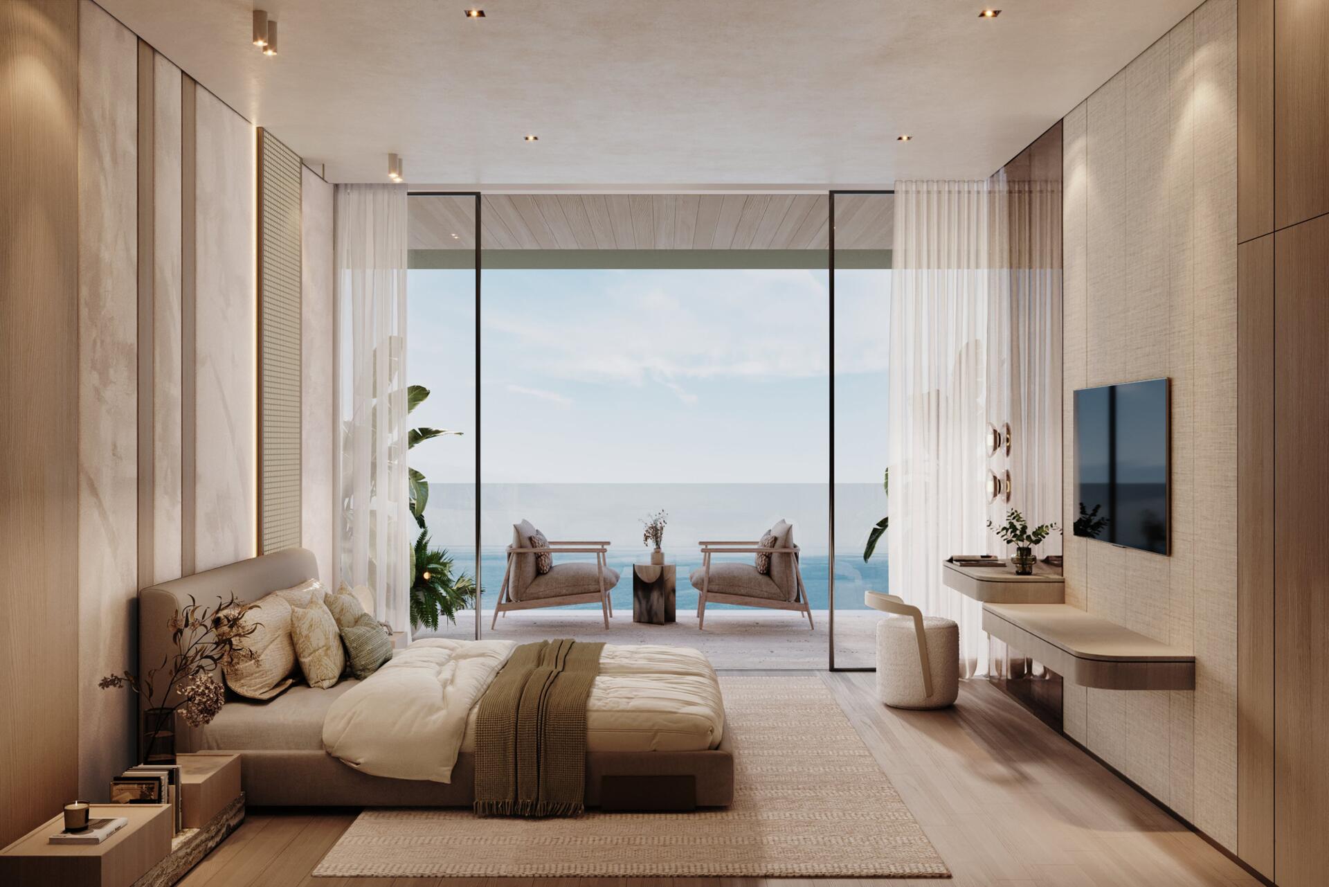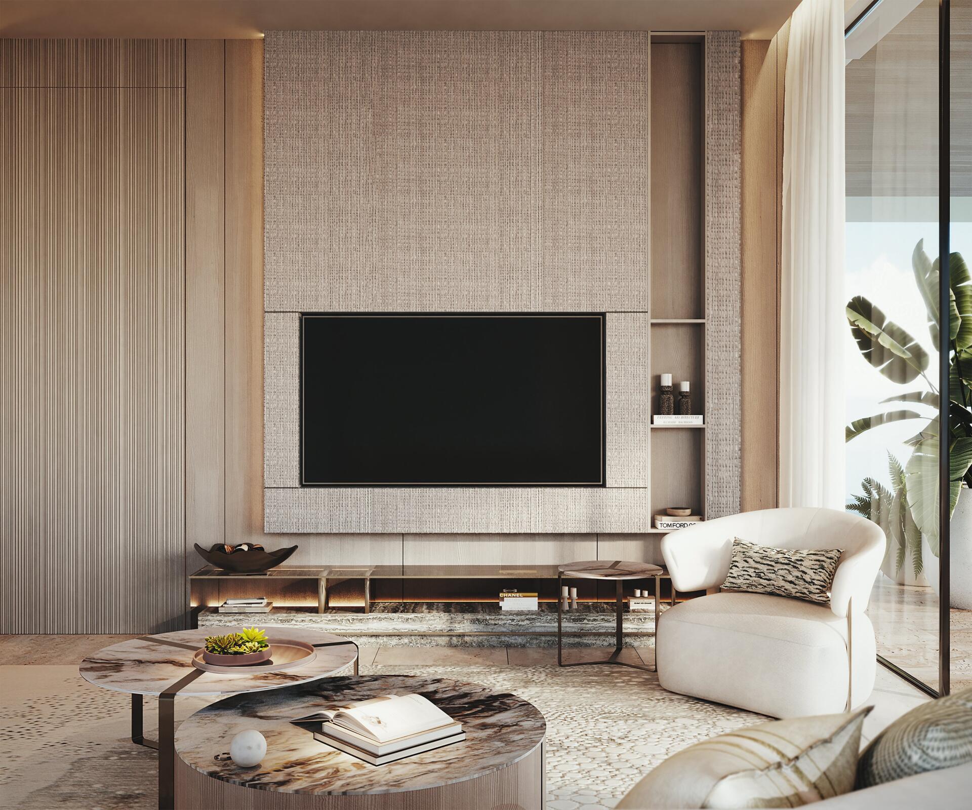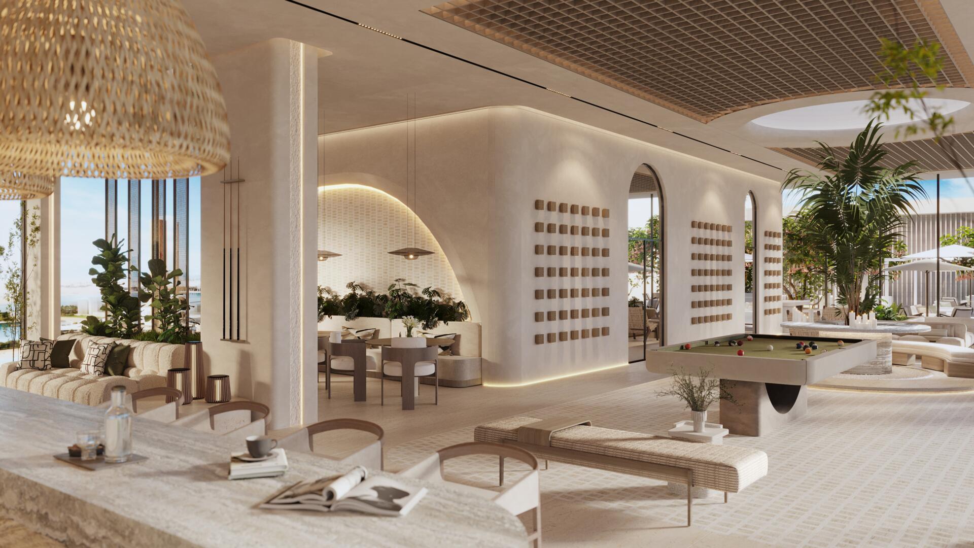 The project features 232 fully furnished residences — studios ranging from 380 to 560 sq ft, 1-bedroom apartments from 800 to 1370 sq ft, and 2-bedroom units from 1500 to 2500 sq ft. All 2BR apartments come with private pools, and every home includes a private balcony. The 1BR and 2BR layouts offer walk-in closets and well-defined spatial circulation. Interiors combine stone and wood finishes, built-in storage systems, soft carpets, neutral upholstery, and warm lighting. Bathrooms feature rainfall showers, stone vanities, and concealed lighting for a refined, spa-like ambiance.