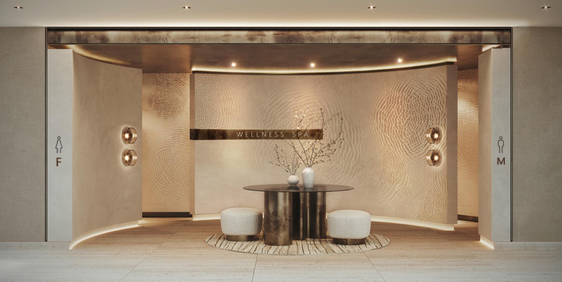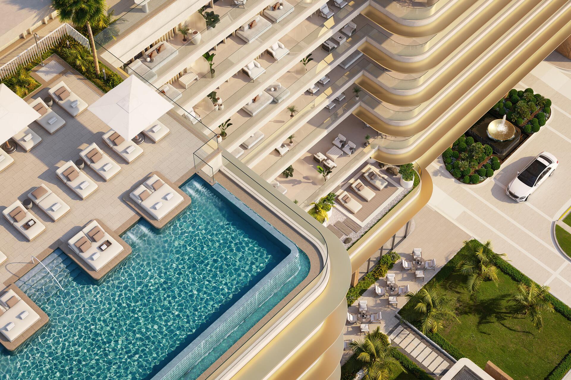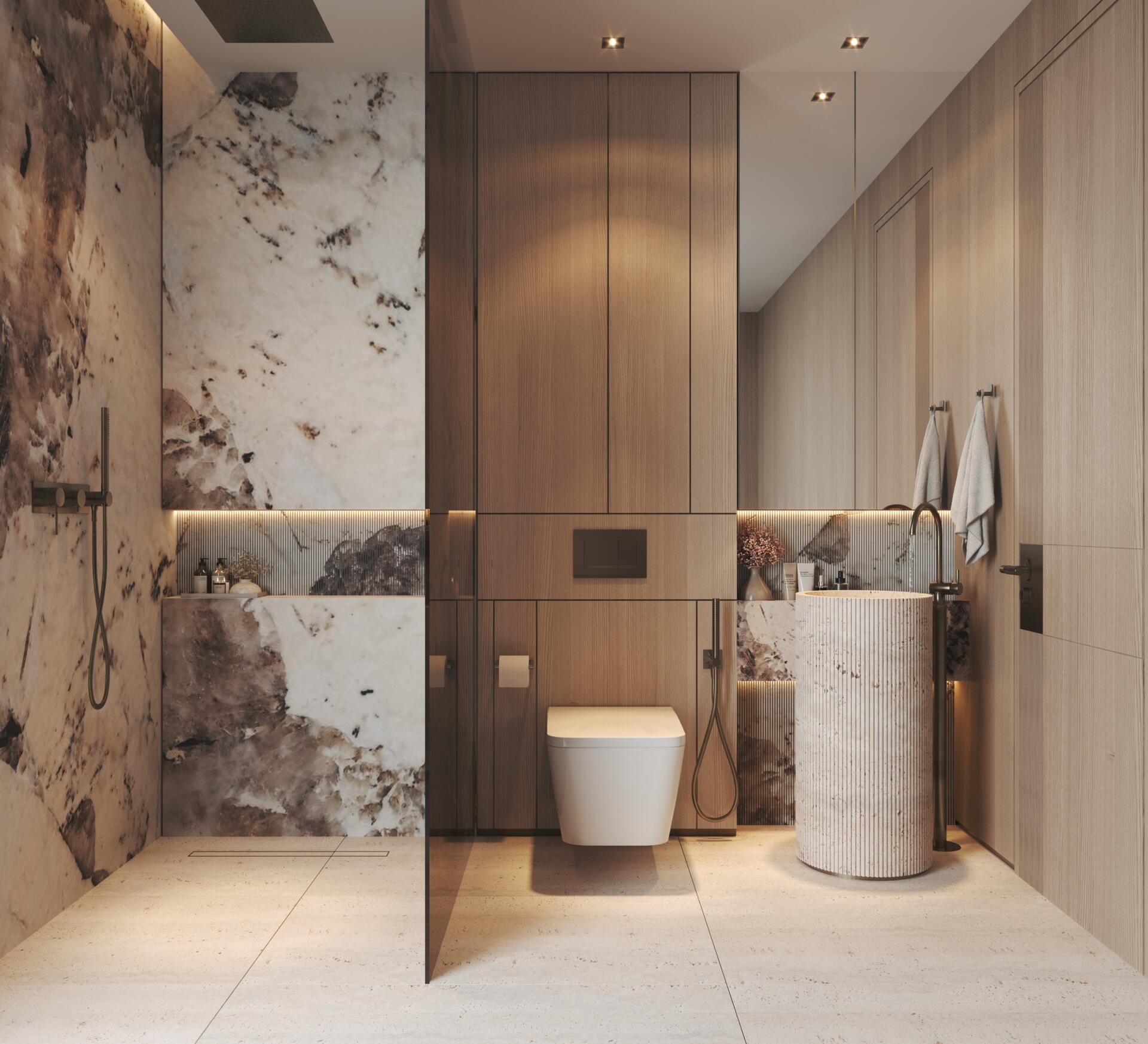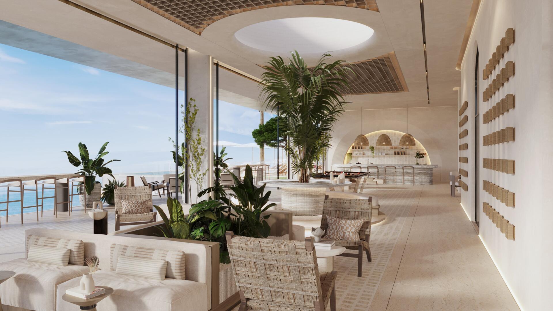 The project features 232 fully furnished residences — studios ranging from 380 to 560 sq ft, 1-bedroom apartments from 800 to 1370 sq ft, and 2-bedroom units from 1500 to 2500 sq ft. All 2BR apartments come with private pools, and every home includes a private balcony. The 1BR and 2BR layouts offer walk-in closets and well-defined spatial circulation. Interiors combine stone and wood finishes, built-in storage systems, soft carpets, neutral upholstery, and warm lighting. Bathrooms feature rainfall showers, stone vanities, and concealed lighting for a refined, spa-like ambiance.