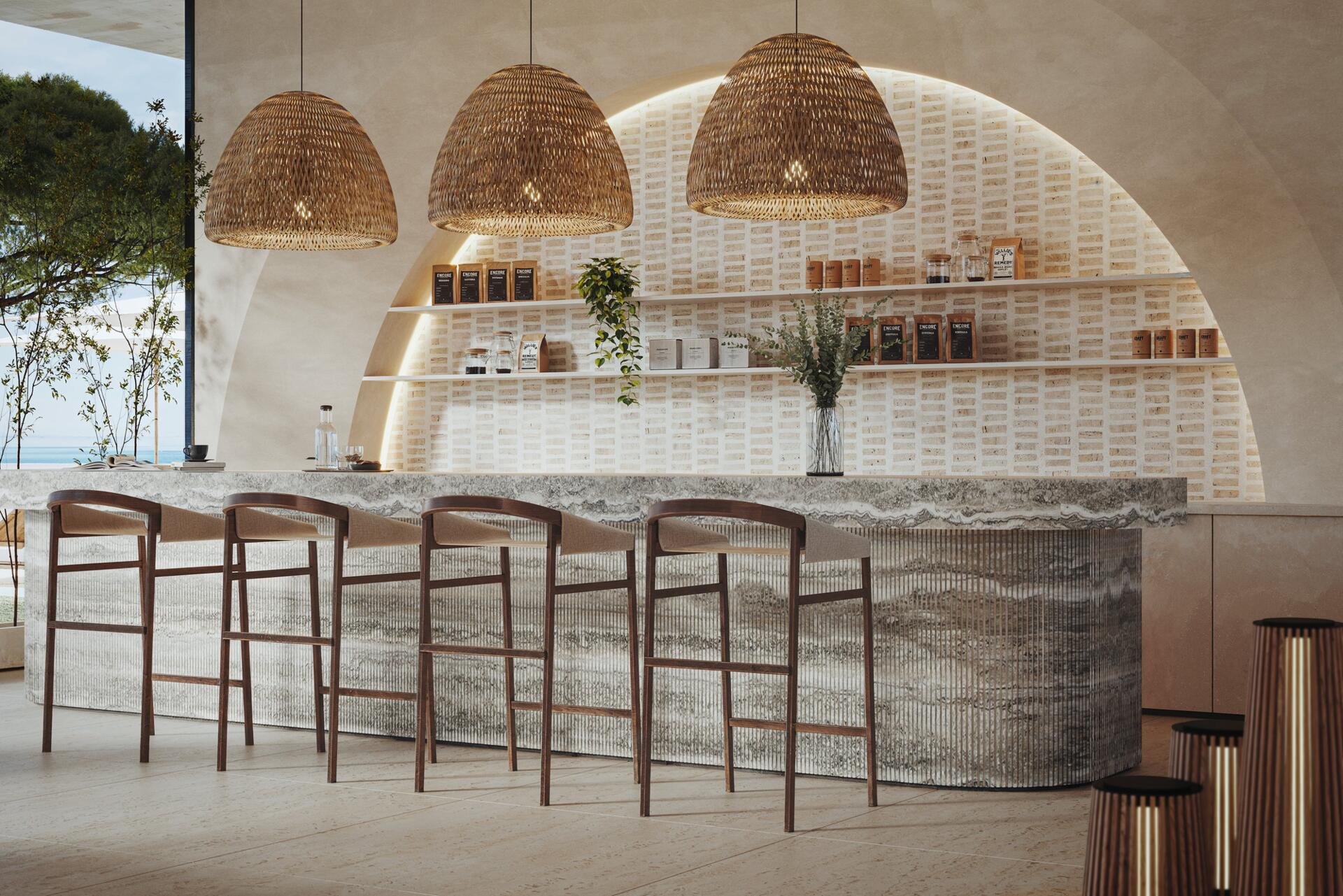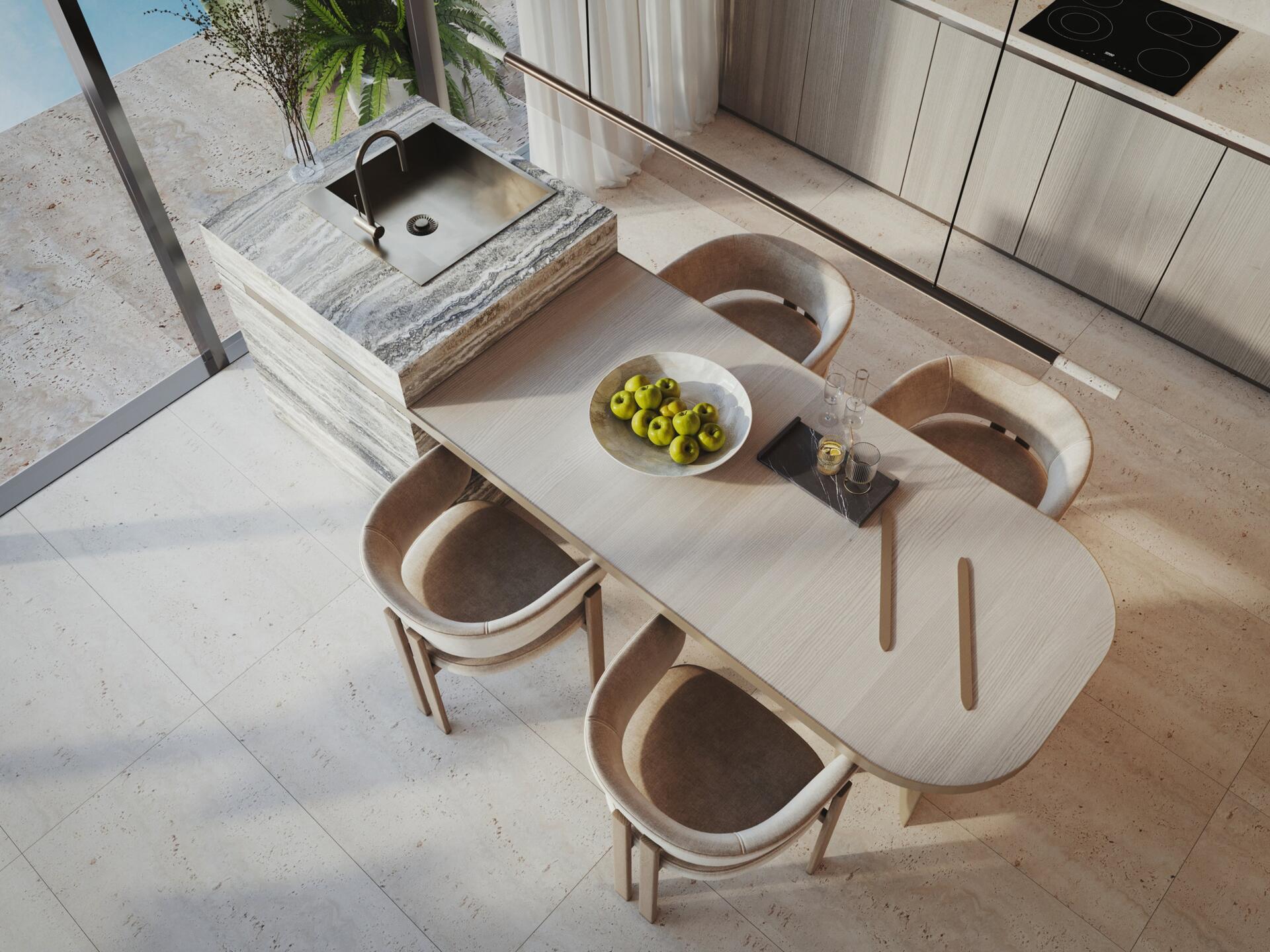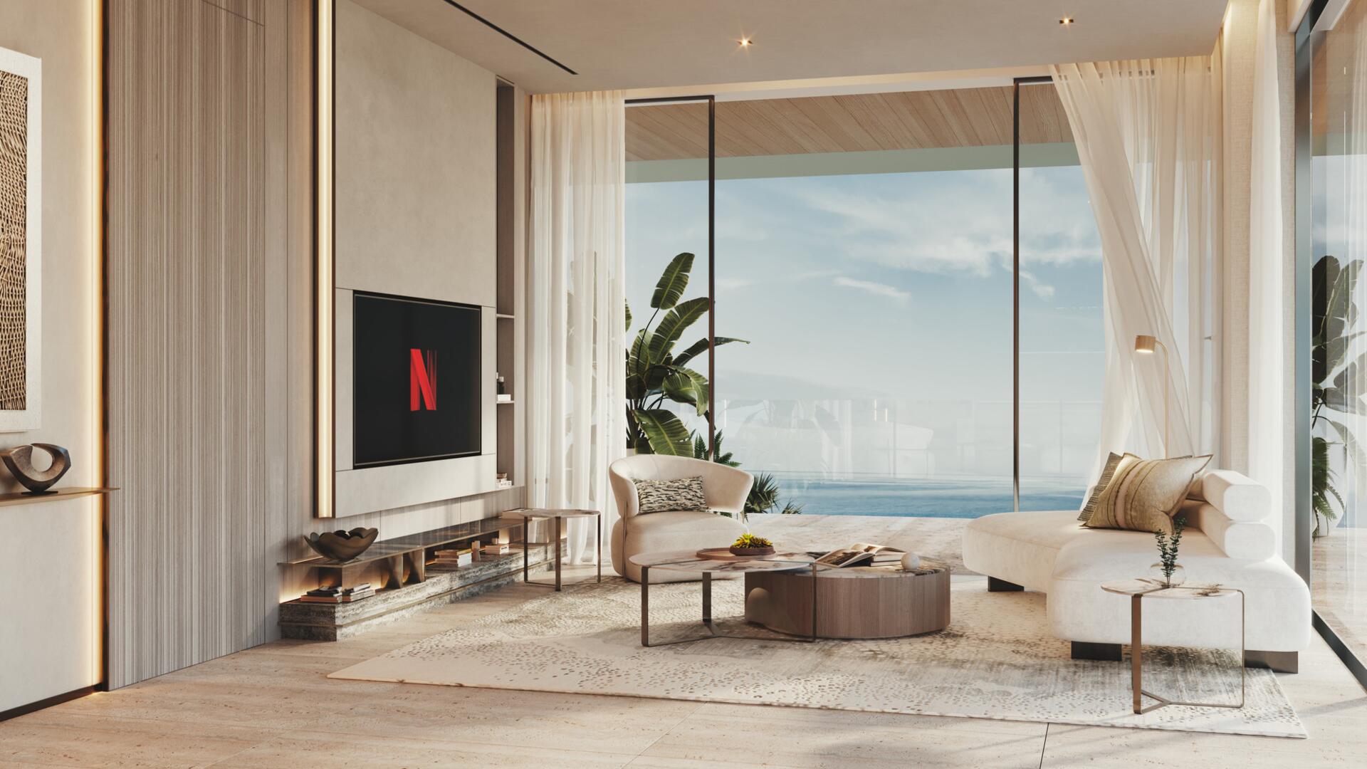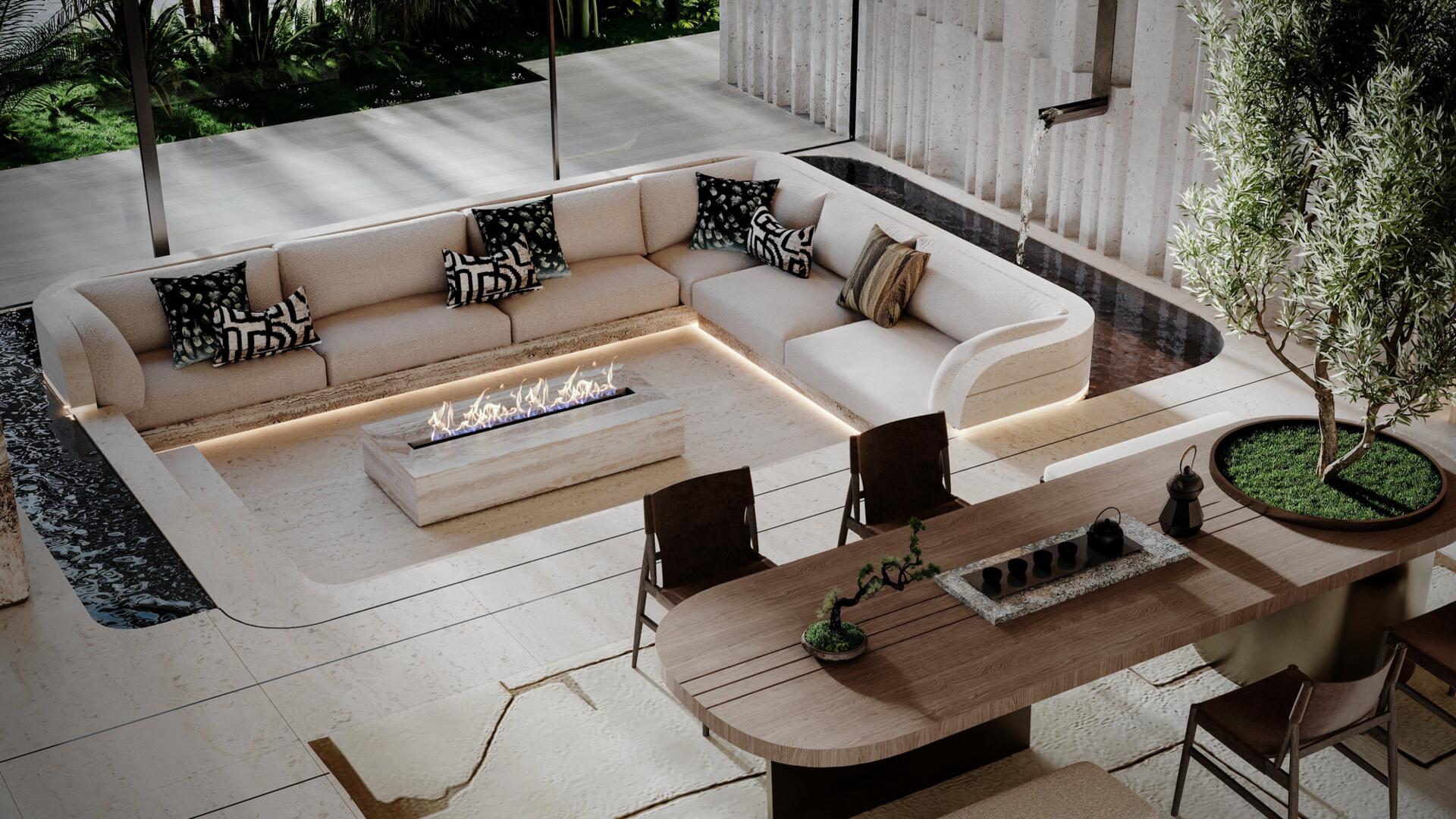 The project features 232 fully furnished residences — studios ranging from 380 to 560 sq ft, 1-bedroom apartments from 800 to 1370 sq ft, and 2-bedroom units from 1500 to 2500 sq ft. All 2BR apartments come with private pools, and every home includes a private balcony. The 1BR and 2BR layouts offer walk-in closets and well-defined spatial circulation. Interiors combine stone and wood finishes, built-in storage systems, soft carpets, neutral upholstery, and warm lighting. Bathrooms feature rainfall showers, stone vanities, and concealed lighting for a refined, spa-like ambiance.